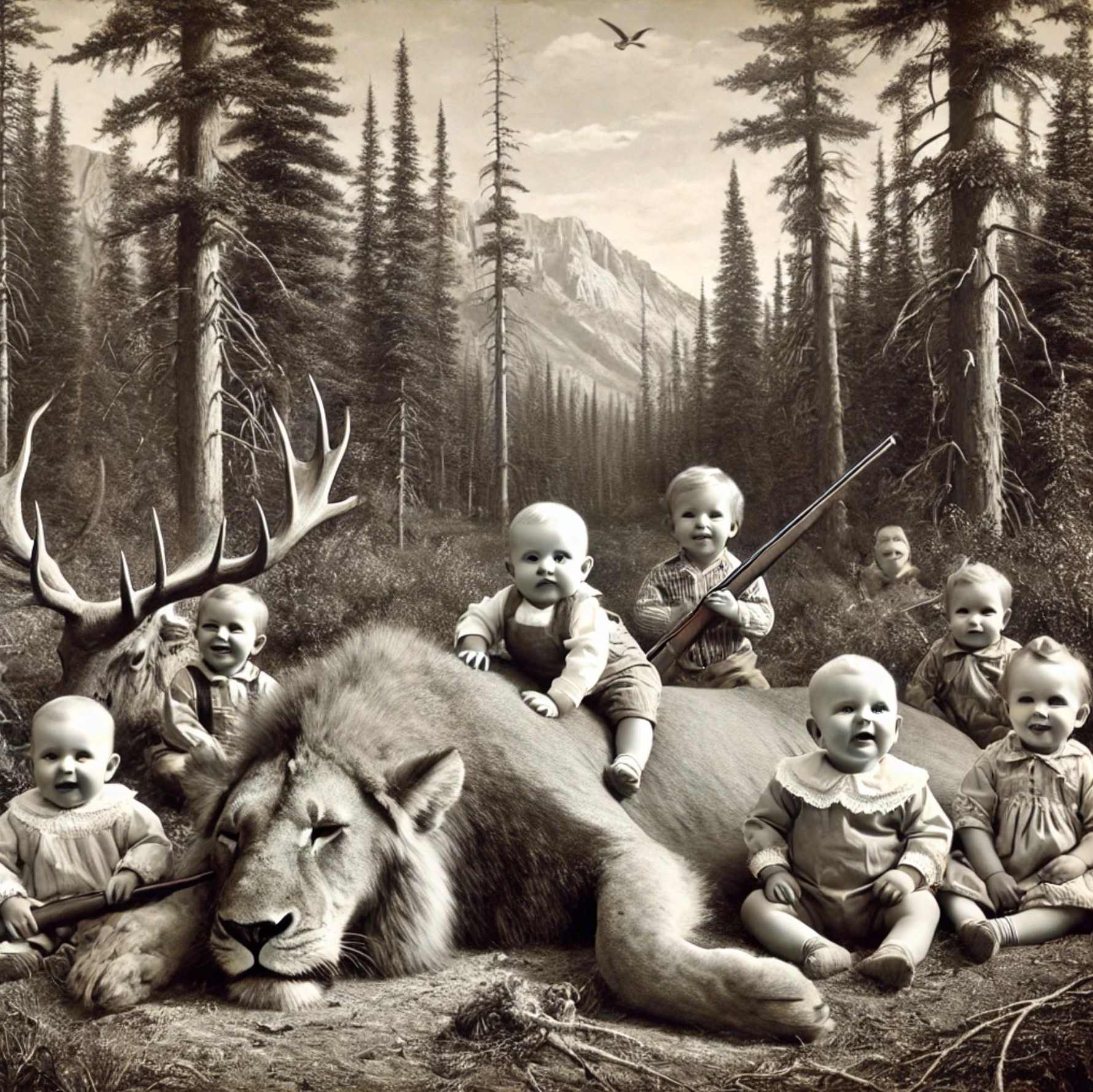 What is particularly interesting is that, in some cases, the animals were generated in a way that often amplified their majestic qualities or mythologized them. Another consistent pattern in these images was the prominent presence of a rifle, which was often exaggerated in scale, making it stand out. This was both predictable and unsurprising. However, one intriguing aspect was that even when the prompt was adjusted, this pattern (of the rifle) was not easily removed and left strange, lingering awkward traces behind.