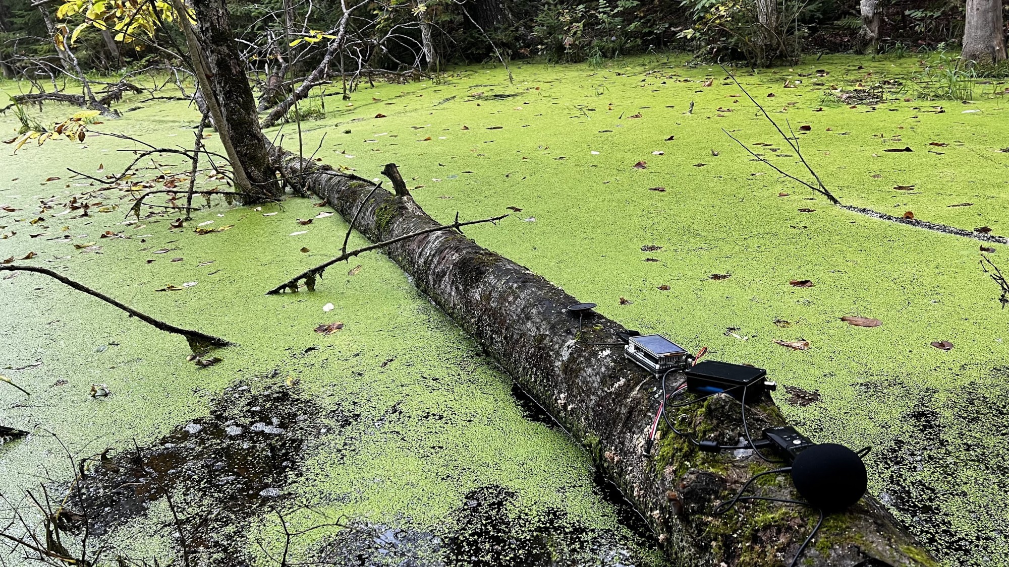 After hearing these sounds for some time, I finally made it to my second rest stop. As Iapproached the spot where I had left my communication device earlier that day, Irealized that the swamps were not entirely empty. A group of rodents was hiding in anearby tree trunk, and they watched me curiously as I approached them.