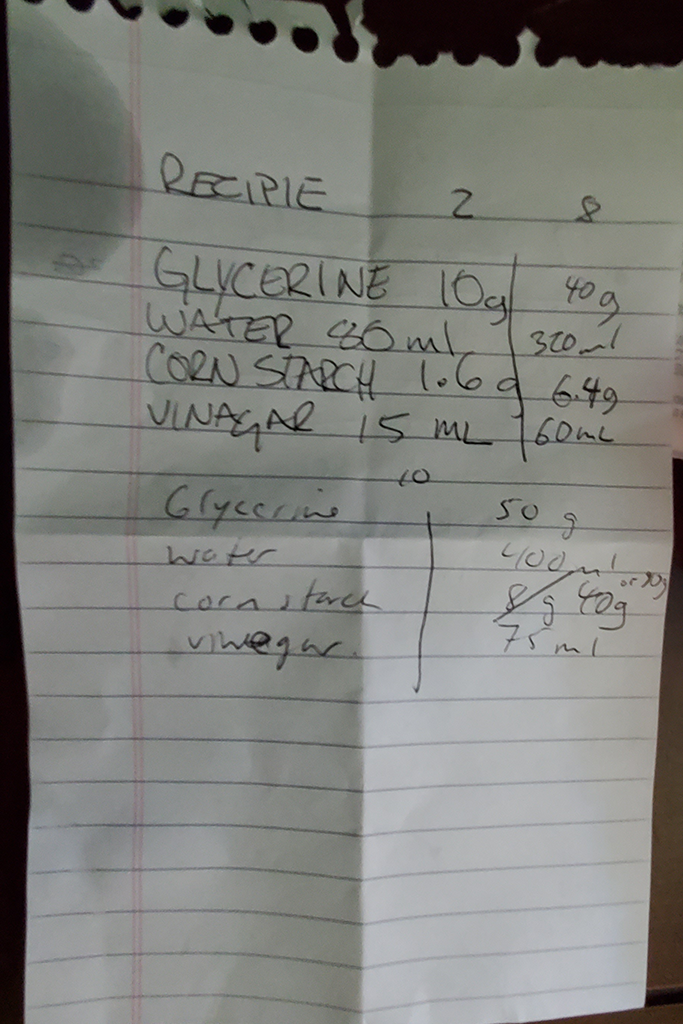 이렇게 물을 실험하기 위해 나는 생분해성 플라스틱으로 용해 가능한 고체를 만들었다. 아이디어는 물에 쉽게 용해되는 고체를 만들면, 시간이 지남에 따라 용해 정도를 측정하고 그 측정을 인터랙티브 설치 작품에서 시간 조정 장치로 사용할 수 있다는 것이었다. 여기서 물은 주제가 아니라 이야기를 이끌어가는 능동적인 작용체이다. 나는 이 실험을 그룹이 만날 전에 가족 다차(별장)에서 진행했다.
