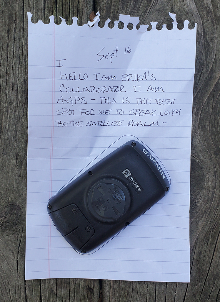 나의 절차는 GPS 수신기를 밤에 켜고 창턱에 놓아두는 것이었다. 내가 자는 동안, GPS는 위성들의 경과를 기록하며 배터리가 다 될 때까지 데이터를 기록한다. 보통 이 과정은 4~5시간 정도의 웨이포인트 데이터를 제공한다. 웨이포인트는 위도, 경도, 고도를 기록한다. 개념적으로 나는 GPS 수신기를 보조 장치로 사용한다. 농장을 둘러싼 산들의 풍경은 내가 접근할 수 없는 곳이었기 때문이다. 육체적으로 내 몸은 더위와 습도를 견디지 못했고, 심리적으로는 숲 속으로 들어가 산을 오르는 것이 두려웠다. GPS는 나의 대리인 또는 대신자가 되어, 내가 잠자는 동안 산을 올라갔다. 아침이 되면 나는 웨이포인트를 그려서 그 여행 경로를 확인했다.