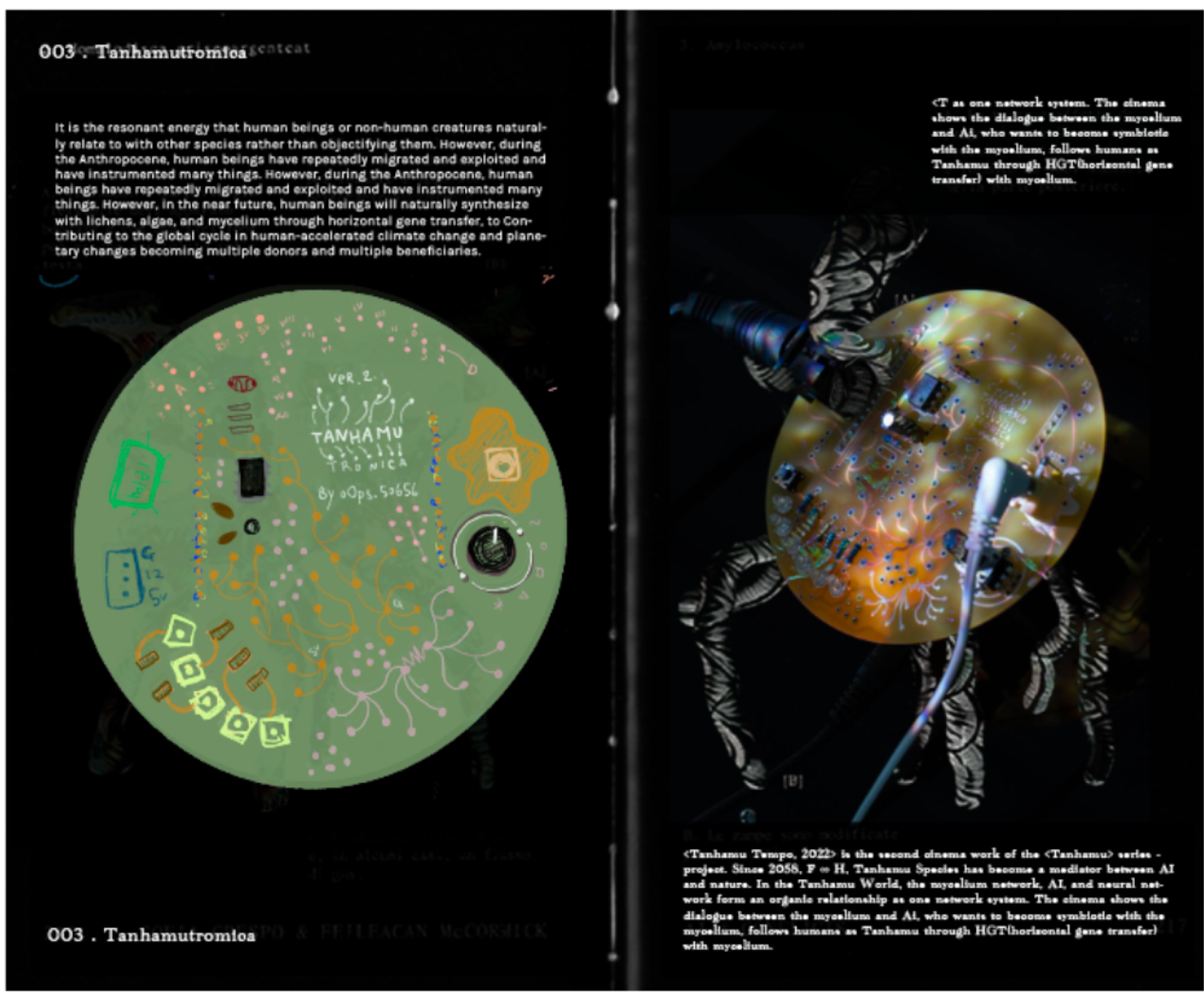 The work involved weaving natural algorithms, such as the mycelial network system of mushrooms and the growth system of trees (L-System), into digital algorithms. This digital mycelium and digital trees, interfacing with the rhythms of living organic life, were integrated into a sound system and hardware, known as the Tanhamutronica instrument. Through this process, sounds collected from the mushrooms were also captured and processed.