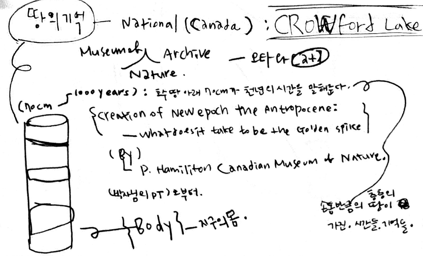 #Telluric Body 지구의 몸과 신체가 말해주는 인류세의 순간, 디아톰의 기하학적 몸, 그리고 크로포드 호수의 골든스파이크 연구와 제주 난류의 변화는 각각 인류세(Anthropocene)의 지질학적, 생태학적 특성을 드러내는 두 가지 중요한 사례다. 크로포드 호수는 인간 활동이 자연계에 남긴 명확한 흔적을 시간적 층위로 기록한 "지질학적 직물"로서, 산업화, 방사능 낙진, 화석 연료 사용과 같은 인류 활동의 흔적을 보여준다. 반면, 제주 난류는 해양 생태계의 자연적 리듬과 기후 변화로 인한 변화를 실시간으로 반영하며, 역동적인 "생태적 직물"로 작용한다. 제주 난류에서 관찰된 미기록종과 조류로 뒤덮인 해안가, 기후 변화로 인한 생물의 이동과 새로운 적응은 이러한 생태적 변화는 단순히 지역적 문제가 아닌, 지구적 차원의 탄소 순환과 생태적 위기의 중요한 지표다. 디아톰과 같은 미세 생물은 탄소를 흡수하고 해저에 침전시키며, 탄소 저장고로 기능한다. 이는 크로포드 호수의 퇴적층이 보여주는 인간 활동의 지질학적 흔적과 제주 난류의 해양 생물 변화가 모두 시간적, 공간적으로 얽혀 있다는 점에서 "위빙"의 개념과 긴밀히 연결된다.