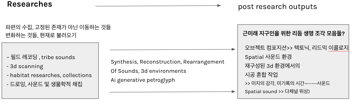 축적된 시간성을, 필드 레코딩한 사운드를, 현재와 동기화하고, 녹음된 리듬을 바탕으로, 다시 현재성을 가지도록 만들기 위한 사운드 연구를 진행. 일반적으로 시간 축으로 인식되는 사운드 합성 방법론에서 주파수 영역에 접근하여, 숨겨진 패턴을 청각적으로 구현할 방법들에 대한 연구.