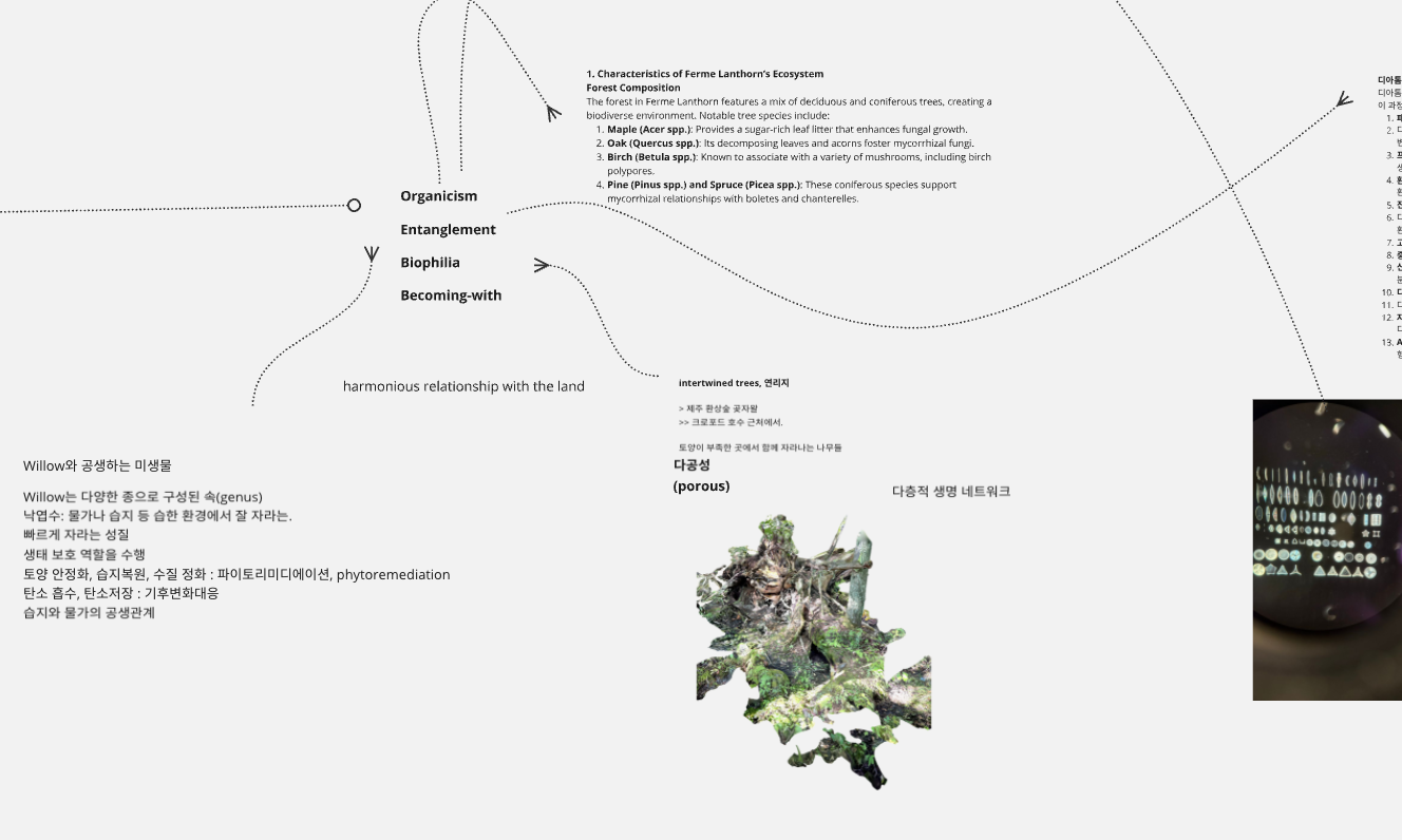 이 연구는 유기적 삶(Organicism), More-than-human, Entanglement, Becoming-with, 사려 깊음(Noticing for Caring)을 중심으로, 자연 깊숙한 곳에 더 가까이 놓이는 순간들을 채집하고, 그 시간을 기록하며, 이를 다양한 매체를 통해 수집하려는 시도이다. 캐나다 Ferme Lanthorn 지역에서의 포리징, 필드 레코딩, 3D 스캔, 제주 및 안동에서의 수집, 그리고 크로포드 호수의 인류세 연구에 대한 리딩, 채집과, 탐구한 것들을 통해 축적된 데이터와 감각을 바탕으로, 이러한 수집물들을 비컨(beacons)으로서 데이터화하거나 감각화하였다. 또한 이 과정에서, 탈식민적 맥락 속에 얽힌 기억과 움직임, 환경의 복잡한 층위를 탐구하며, 급변하는 기술 환경 속에서 감각의 역사와 공유된 기억을 추적하고자 했다.